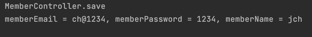 System.out.println("memberEmail = " + memberEmail + ", memberPassword = " + memberPassword + ", memberName = " + memberName);