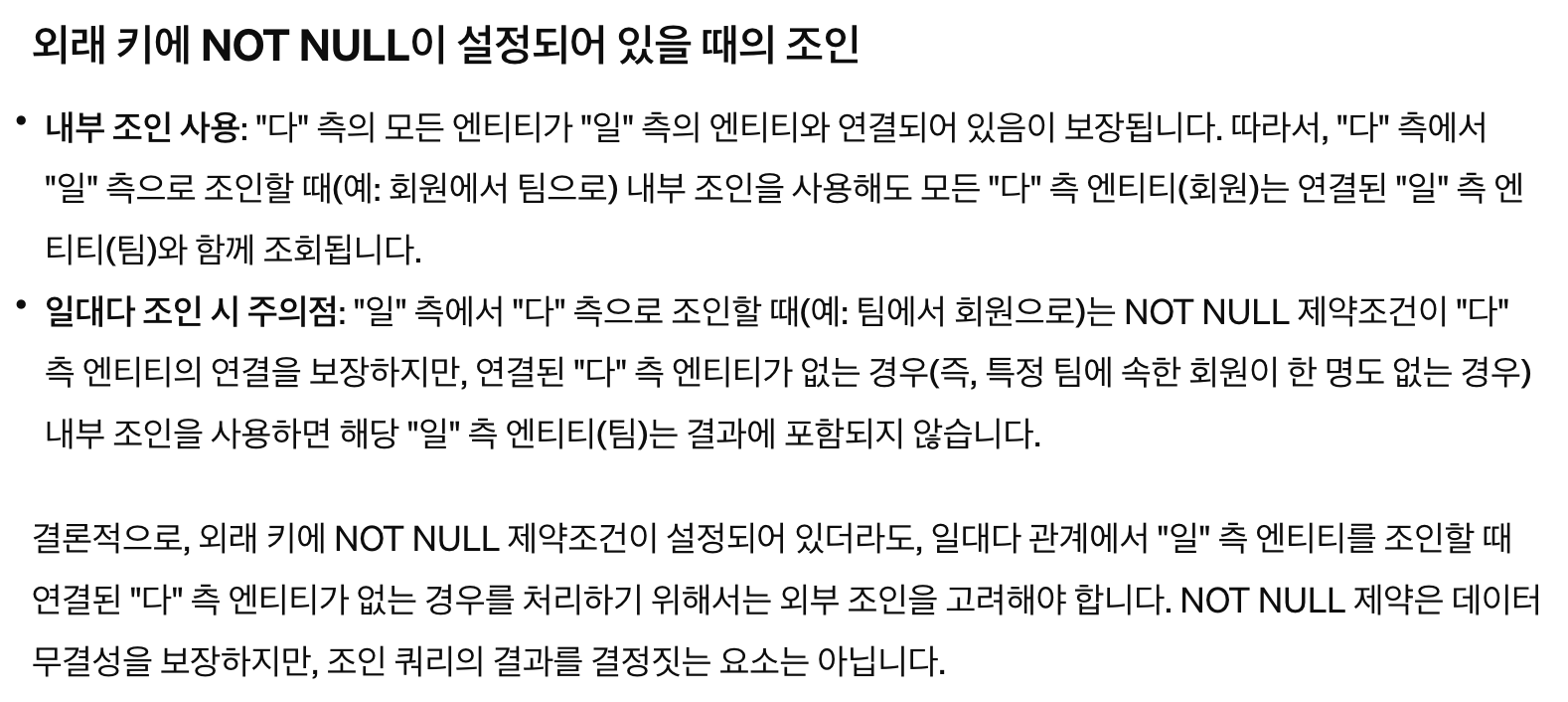 회원 테이블과 팀 테이블을 조인할 때 회원 테이블의 외래 키에 not null 제약조건을 걸면