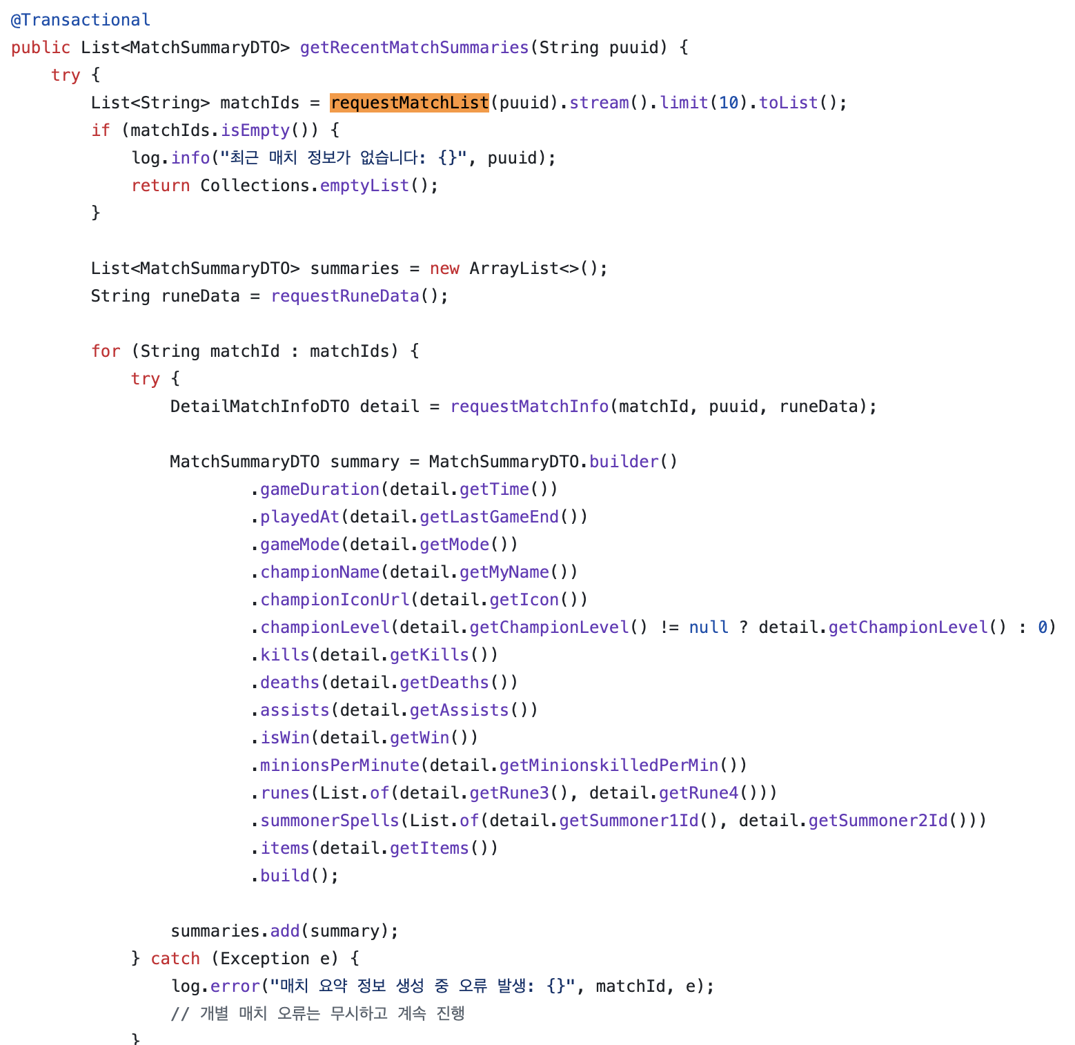 그 후 일일이 동기 방식으로 MatchSummaryDTO에 저장하고 있다.