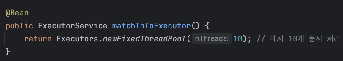 사전에 매치 10개를 비동기로 하기위한 스레드풀은 빈으로 등록해놓았다.