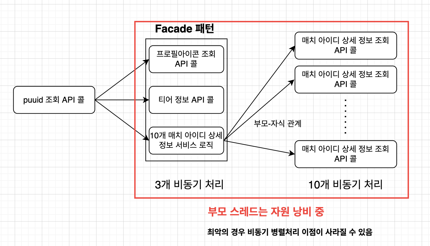 - 기존 구조: RiotFacadeImpl은 RiotAPIService에게 전적 요약 가져오기라는 큰 임무만 맡겼습니다. 실제 10개의 매치를 병렬 처리하는 책임은 RiotAPIService 내부에 숨겨져 있었습니다.
