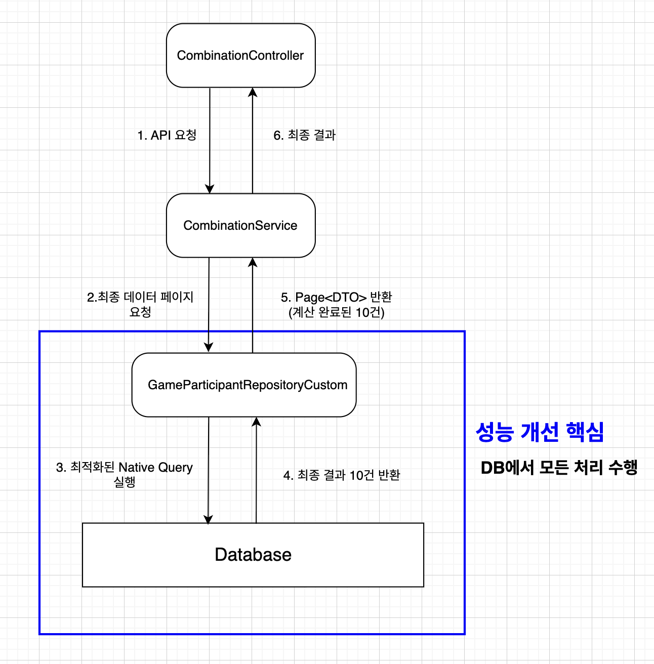 - 첫 구현은 메모리 중심 설계로 하였습니다. DB에서 GameParticipant 전부를 읽어 와 자바 컬렉션으로 그룹핑, 집계, 정렬, 페이징까지 처리하는 방식입니다.