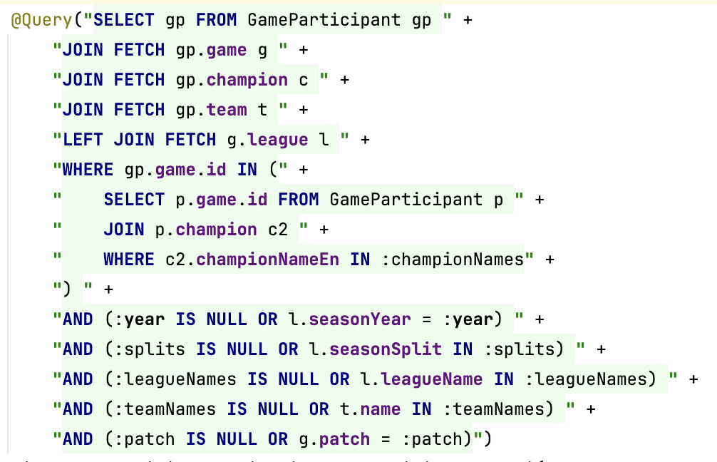 - 표준 JPQL로는 불가능한, 동적으로 계산된 '챔피언 조합' 문자열을 기준으로 그룹핑하기 위해 Native Query와 DB 고유 함수(GROUP_CONCAT)를 사용했습니다.