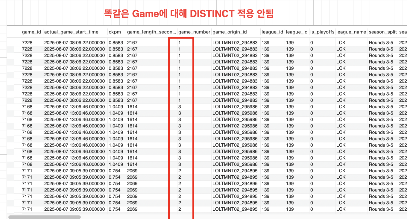 GameParticipant 특성상 1개의 Game에 10개 GameParticipant가 중복되므로 DISTINCT를 해주어야 합니다.