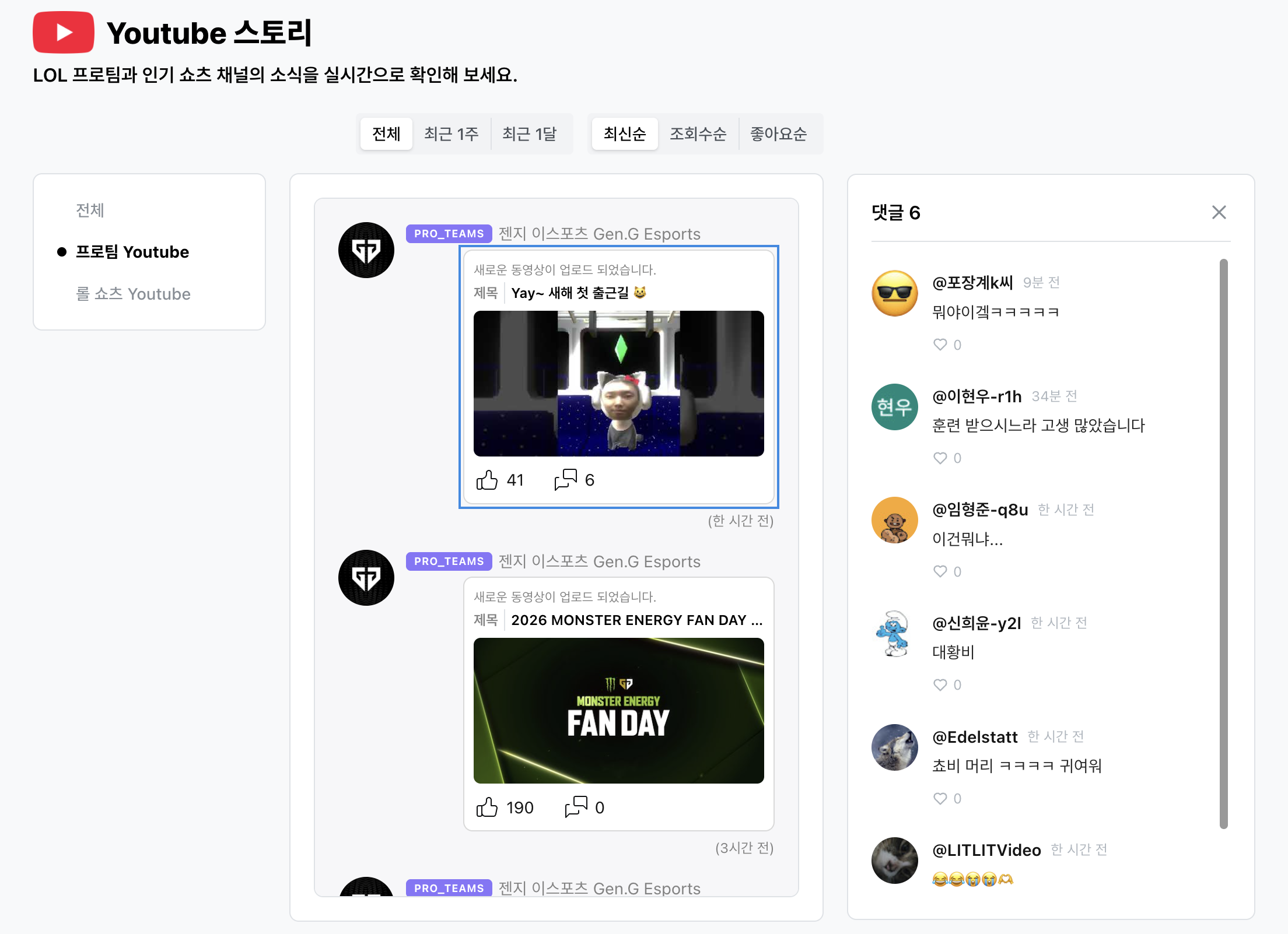 유튜브 데이터를 실시간 저장하도록 구축하고 프로팀, 유명 롤쇼츠 채널을 묶어서 보여주는 기능입니다.
