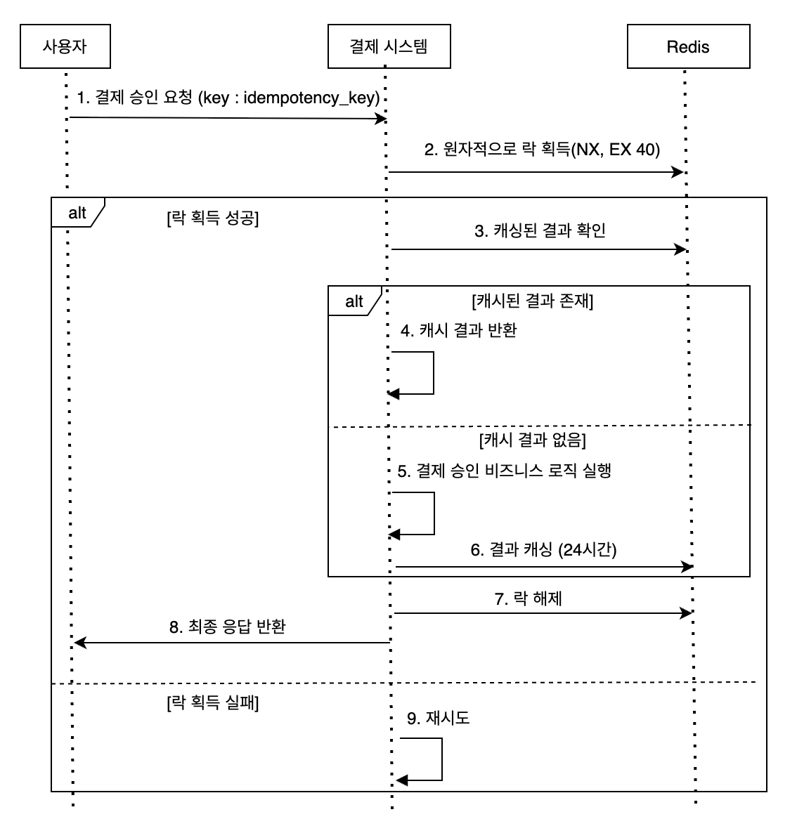 요청이 들어오면 먼저 Redis에 해당 멱등 키로 락을 획득하려고 시도합니다. Redis의 SET NX EX 40 명령어를 사용하는데, 이는 "키가 없을 때만 값을 설정하고, 20초 후 자동 만료"를 원자적으로 수행합니다. 이 시점에 캐시가 있다면 이미 다른 요청이 처리를 완료한 것이므로, 락을 해제하고 캐시된 결과를 그대로 반환합니다. 캐시가 없다면 실제 결제 검증 로직을 수행하고, 완료 후 결과를 Redis에 24시간 TTL로 캐싱합니다. 마지막으로 락을 해제하여 대기 중인 요청들이 캐시된 결과를 읽어갈 수 있도록 합니다.